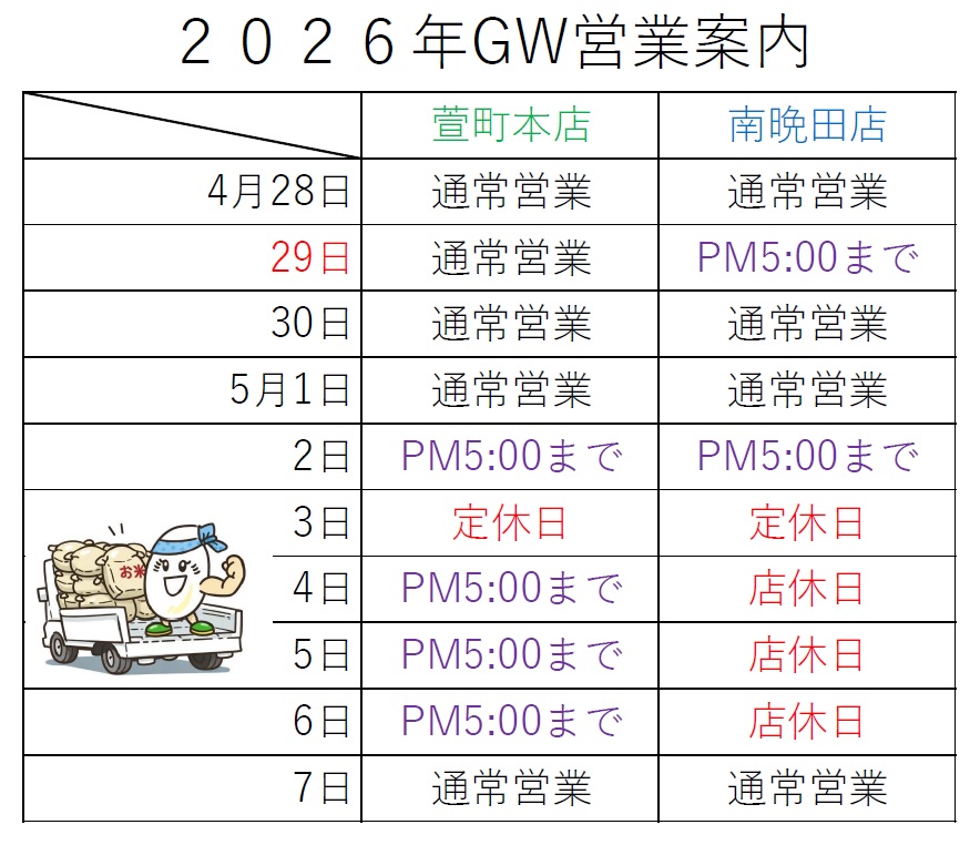 南晩田店では、小型精米機にて精米もいたしますので、お気軽にお申し付けください![]()