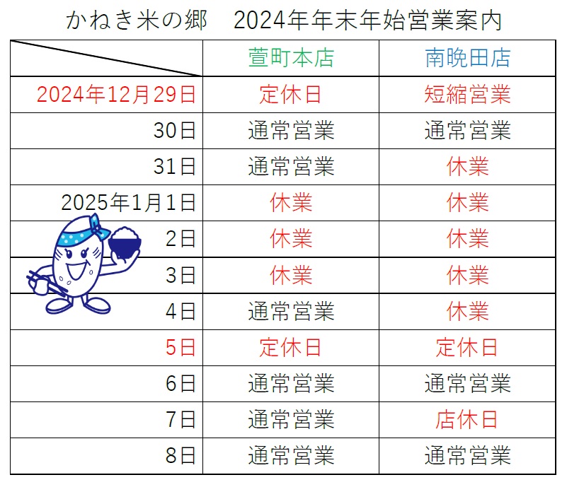 南晩田店は6日間休業後、1月7日も店休日となりますのでご注意ください。