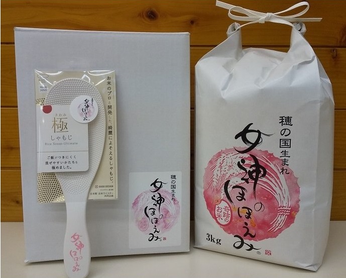 お米3kgと女神のほほえみロゴ入りしゃもじと箱がセットになっています。